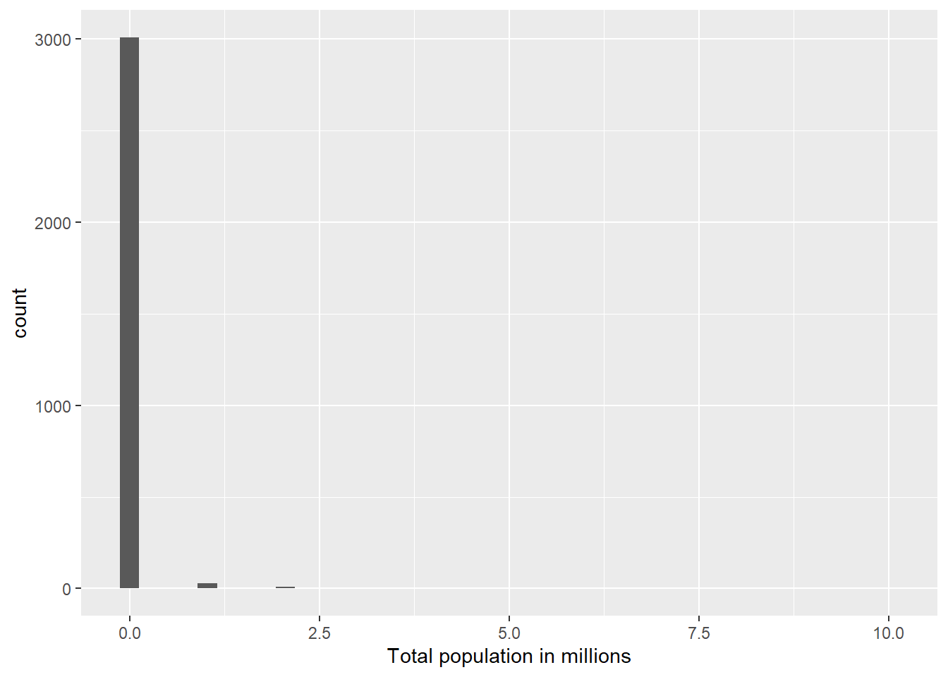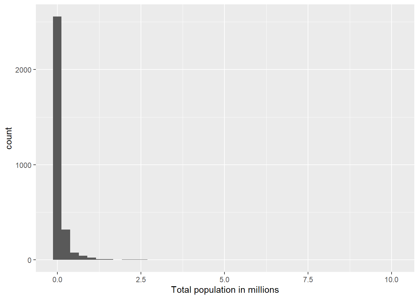 vaccine_data |>mutate(tot_pop_millions = tot_pop /1000000) |>ggplot(mapping =aes(x = tot_pop_millions)) +geom_histogram(bins =40) +labs(x ="Total population in millions")