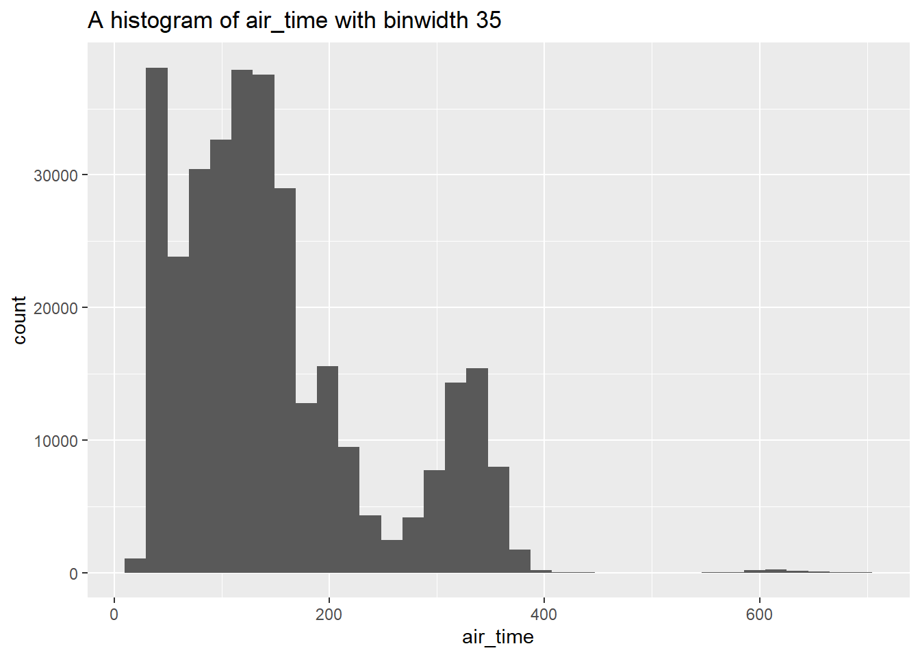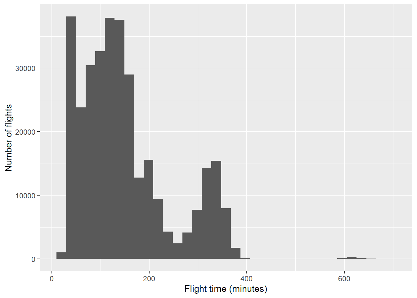 labs(x = "Flight time (minutes)", y = "Number of flights")