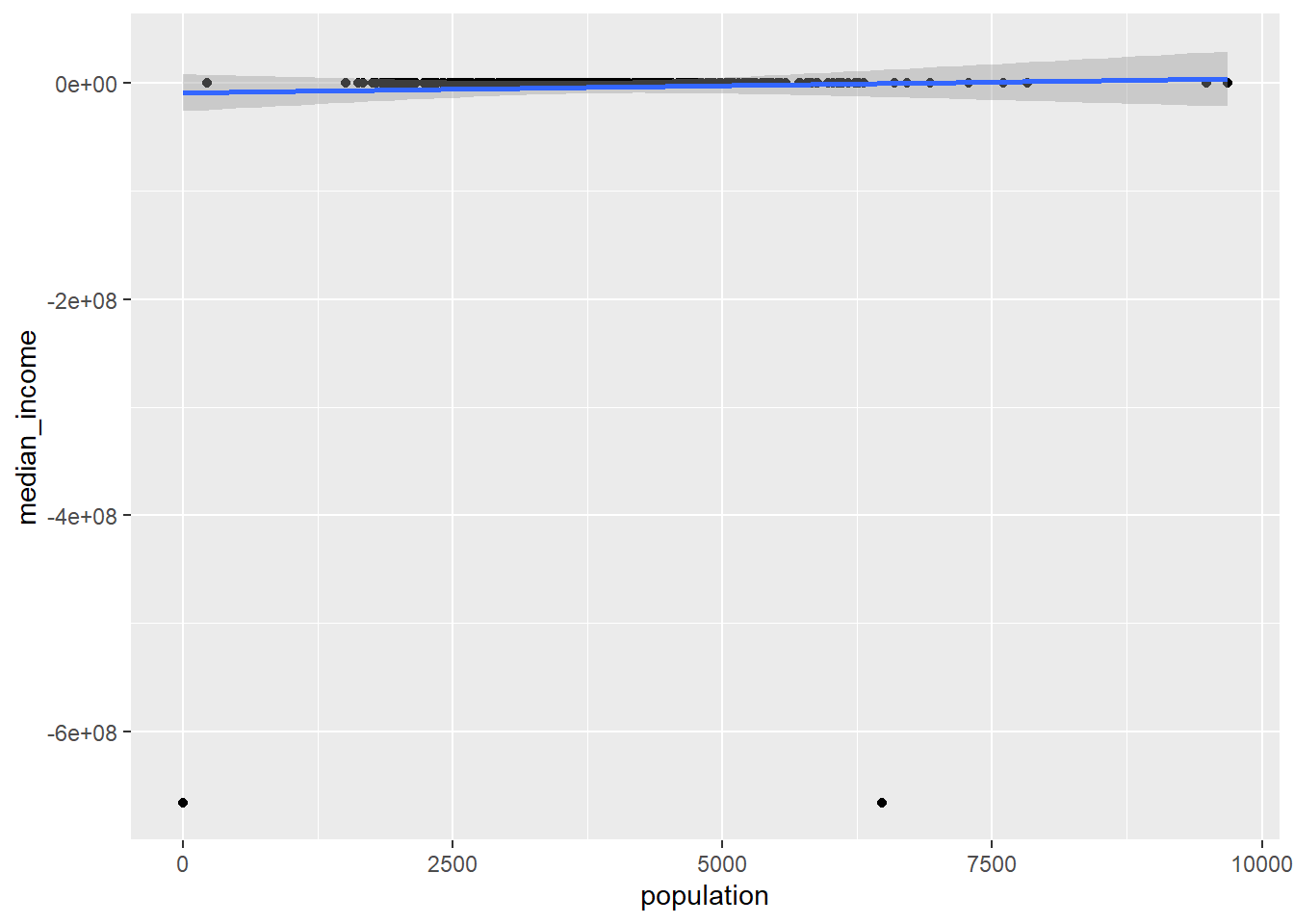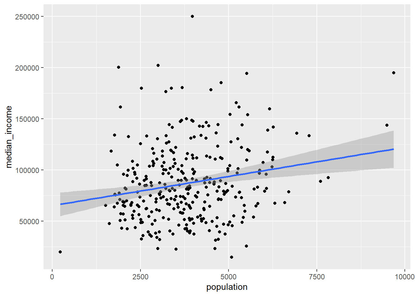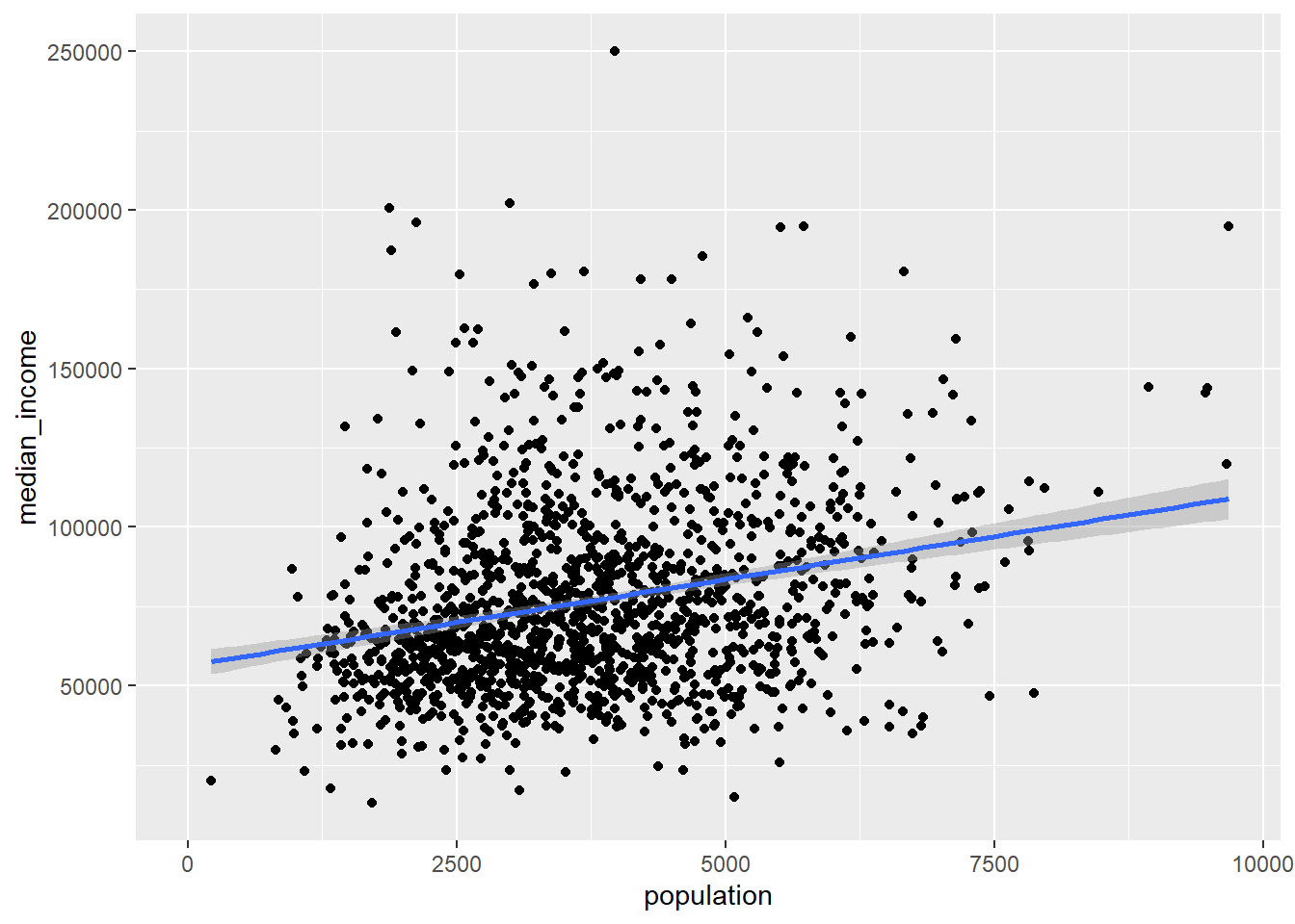 # Look for relationships between variables with 1 row per tractas_tibble(sample_acs_data) |>ggplot(aes(x = population, y = median_income)) +geom_point() +geom_smooth(method ="lm")