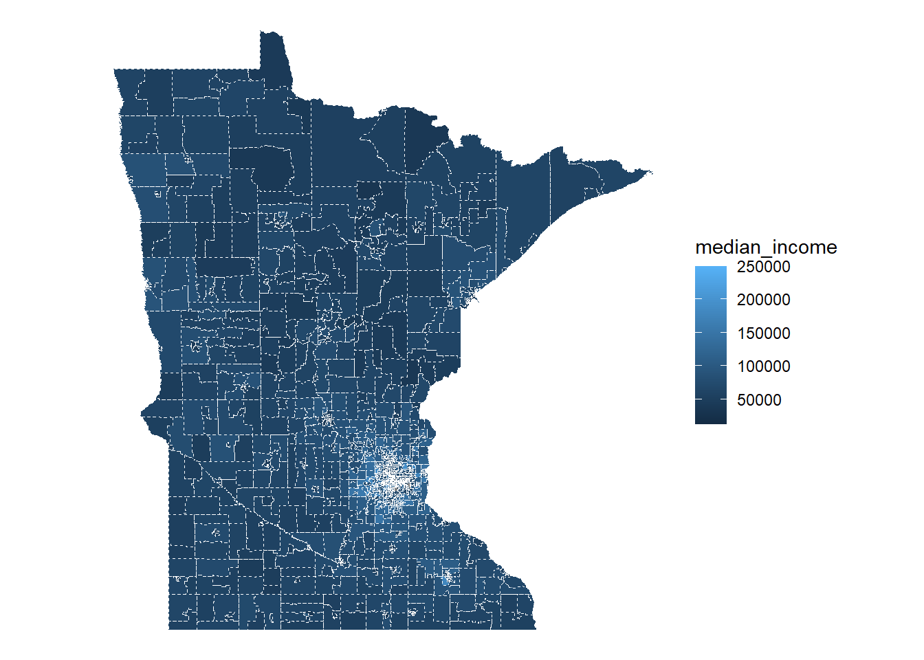 # The whole state of MN is overwhelming, so focus on a single countysample_acs_data |>filter(str_detect(NAME, "Ramsey")) |>ggplot() +geom_sf(aes(fill = median_income), colour ="white", linetype =2)